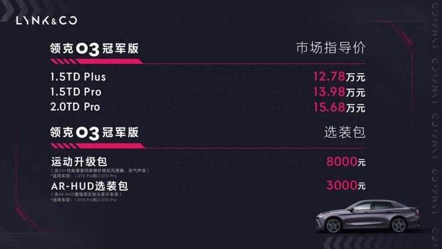 领克旗下潮·燃运动轿车——领克03冠军版正式上市。此次上市的新车共有3个不同配置车型供消费者选择,1.5TD Plus、1.5TD Pro、2.0TD Pro三种配置,售价分别为12.78万元、13.98万元和15.68万元。与此同时,新车还提供了AR-HUD选装包和运动升级包给用户进行选装,如果两者同时选择,还能享受立减2,000元的限时福利。